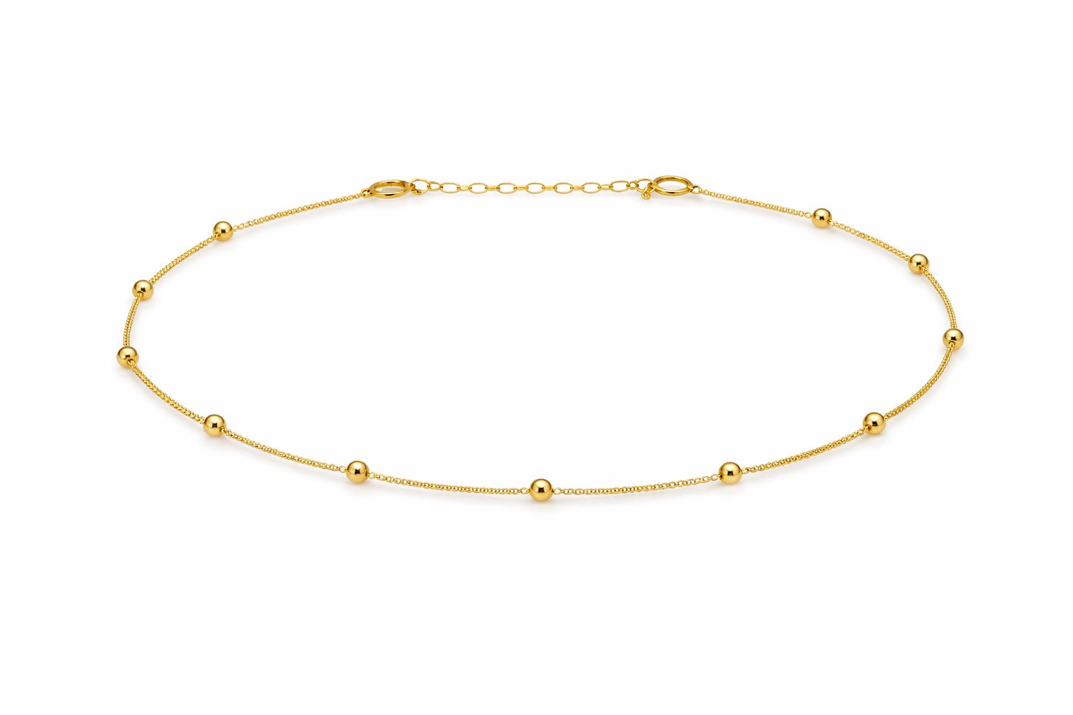 A corrente fina é pontuada por pequenas bolinhas metálicas distribuídas de forma regular ao longo da peça, criando textura sutil e movimento discreto. O acabamento dourado (tipo de acabamento) reforça o brilho uniforme e contribui para a estética atemporal da choker.