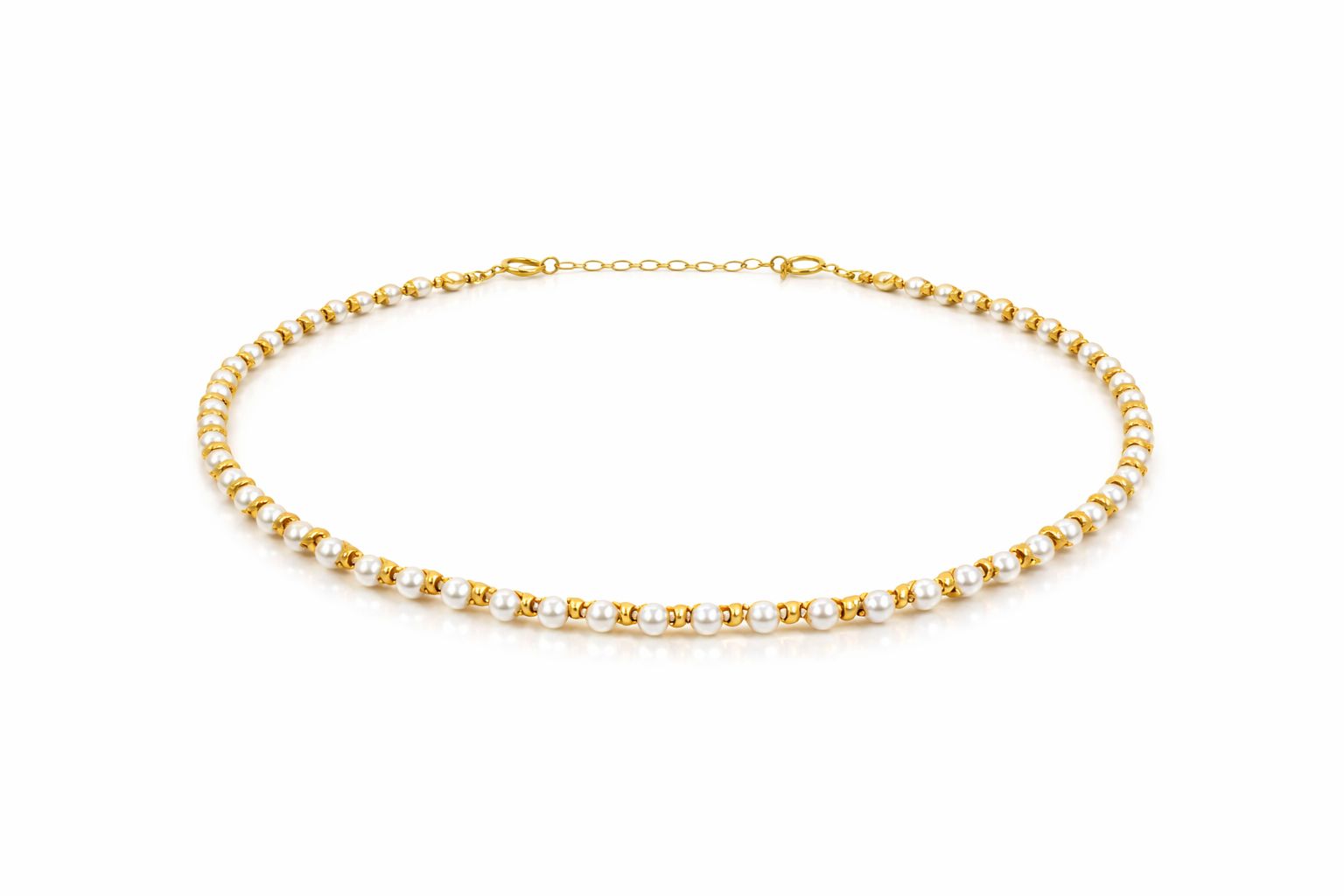 As pérolas aparecem de forma intercalada ao longo da corrente, criando ritmo visual e valorizando o contraste entre o brilho suave das pérolas e o acabamento metálico dourado. O desenho linear acompanha bem o contorno do colo, mantendo proporção e harmonia no uso.